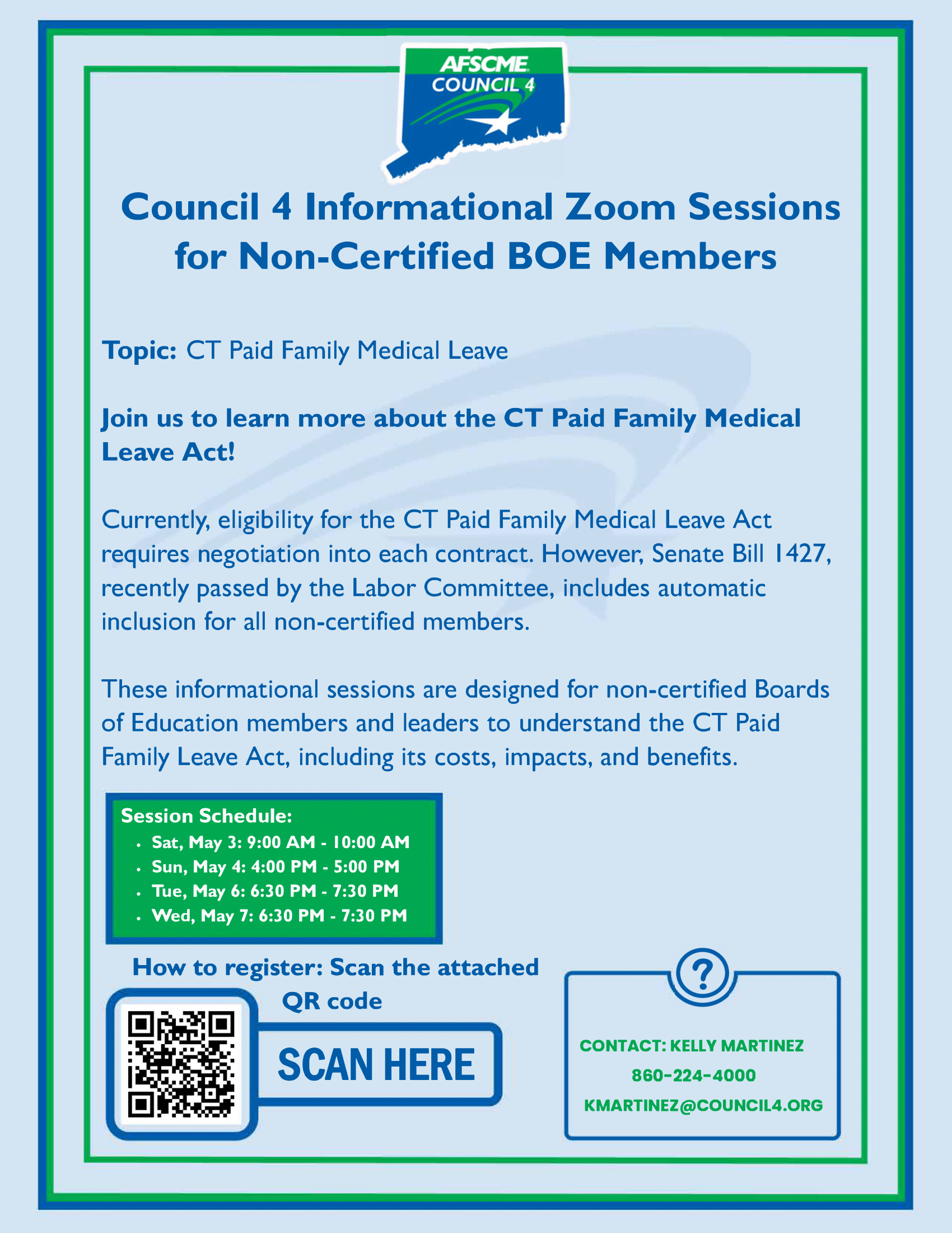 Currently, noncertified staff can enroll in the Connecticut Paid Family and Medical Leave Program if the bargaining unit negotiates to be included. Senate Bill 1427 would automatically enroll noncertified staff into the CT Paid Family Medical Leave Program and these informational sessions are an opportunity for us to discuss this possible change and what it could mean.